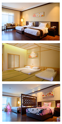 酒店總建筑面積30000多平方米,主樓高6層,設有150余間標準客房、家庭客房、日式客房和別墅客房。房內設計新穎別致,充分考慮家庭度假需求,最小房型面積在50平米以上。